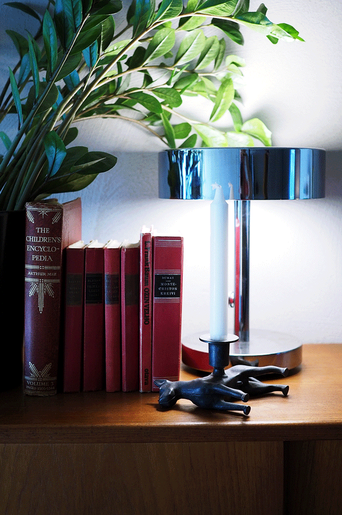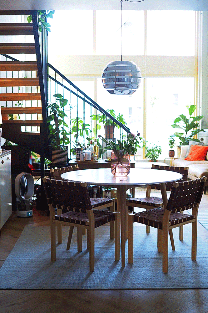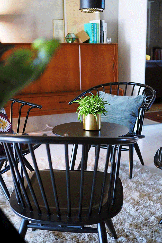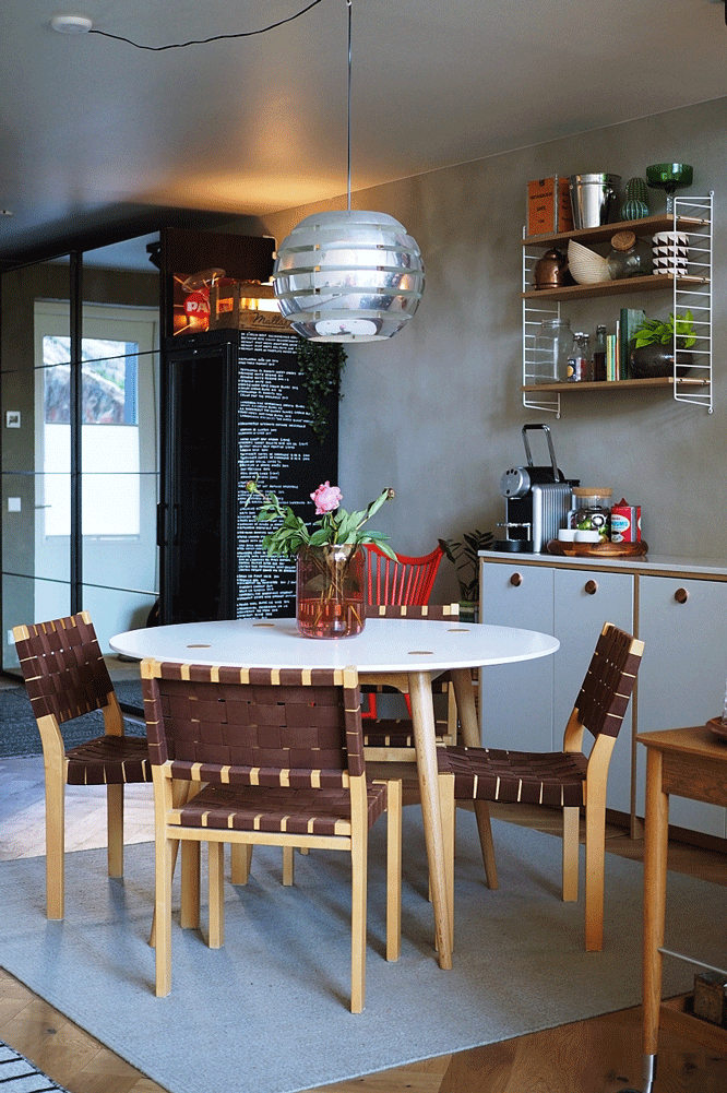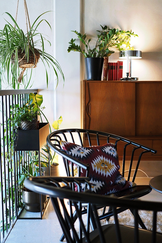 Meidän tyyli on skandimoderni yhdistettynä boheemimpaan stailiin. Olemme molemmat entisiä ikealaisia, joten suunnittelu ja myös kalusteiden kokoaminen on tuttua hommaa. Olemmekin keräilleet huonekaluja valmiiksi jo vuosien ajan, sitten vain toimme ne tänne – tämä on juuri sopiva asunto kaikille löydöillemme. Sisustus syntyi yhdistämällä uutta ja vintagea. Ikean erikoismallistojen kalusteet yhdistyvät kodissamme sujuvasti perintökalleuksiin. Mikon mummolasta löytyi esimerkiksi Artekin neljän Crinolette-tuolin tuoliryhmä. Tuolien päällä oli aikoinaan kiipeilty ja hypitty, kunnes Alexander näki ne ja silmät lautasina kysyi, että tiedetäänkö kuinka arvokkaita ne ovat. Ruokapöydän ympärillä olevat Artekin satulavyötuolit ovat puolestaan huudettu Kokkolasta Kaarlelan seurakunnan huutokaupasta. Alexanderin vanhemmat soittivat, että onko tuollaiset tuolit mistään kotoisin, saivat lopulta huudettua ne itselleen 30 euron kappalehintaan.