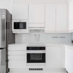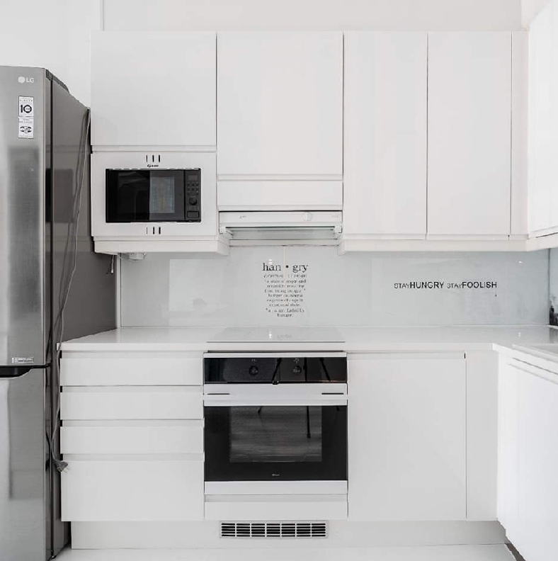 Poimin vinkkejä remppaan jutellessani kavereiden ja muiden naapureiden kanssa, tsekkasin myös EKE Loft -malliasunnon. Sieltä löysin mm. Idean valkoiseen sementtilattiaan. Vaalea lattia kiinnosti sen takia, että se toi paljon valoa asuntoon ja sementin päälle voi myös helposti asentaa tulevaisuudessa jotakin muuta materiaalia. Muita itselleni ehdottomia juttuja olivat keittiösaareke ja klassisen vaaleat keittiökaapit. Välitilaan asennettiin lasi, jonka taakse laitettiin itse suunnittelemaani printtipaperia. Paperiin tuli mm. Batmania ja itselleni merkityksellisiä sanontoja. Jääkaappikin oli tärkeä, sen valitsin mahdollisimman korkeaksi, koska kolmen metrin huonekorkeus antoi myöten.