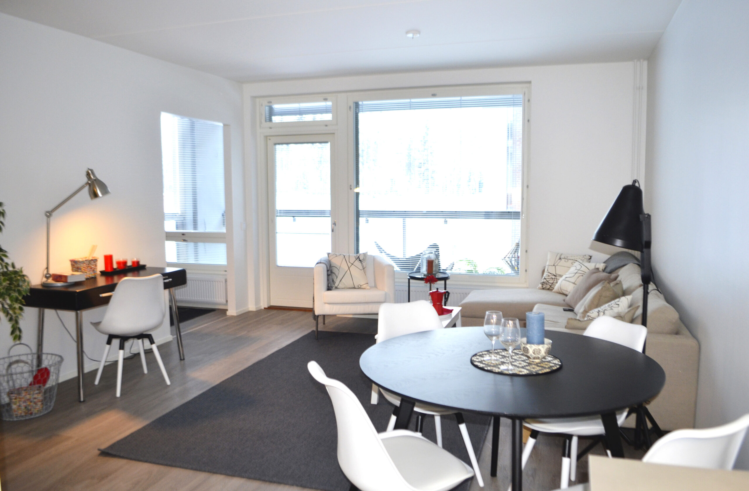 Pohjakerroksen asuntoihin kuuluu oma terassilla ja istutusalueella varustettu piha. Ylempien kerrosten asunnoissa on lasitetut parvekkeet.