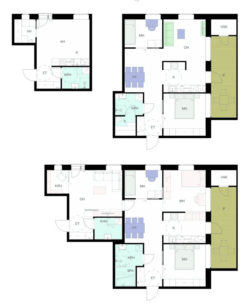Kuvassa ylhäällä olevat asunnot A. ja B. voidaan asukkaan tarpeiden mukaan yhdistää suuremmaksi huoneistoksi ja näin tuoda muuntojoustavuudella lisäarvoa ja asumismukavuutta.