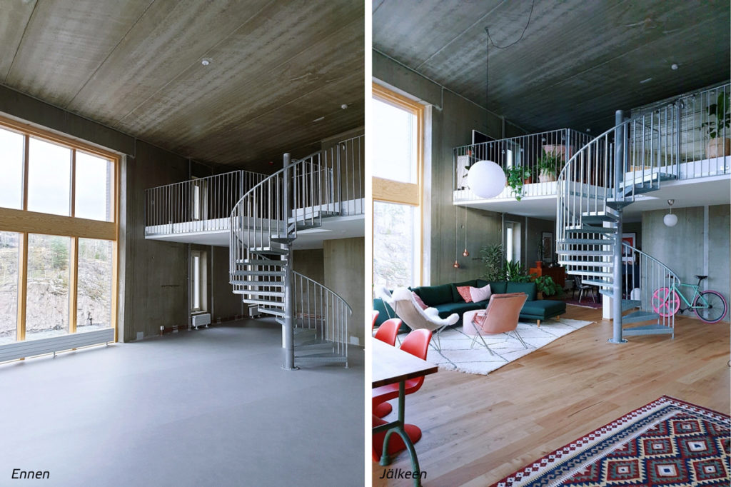 Raakapintaisessa asunnossa on myös erittäin mieluisa ekologinen näkökulma. Joskus nimittäin asuntoa ostettaessa jokin ratkaisu on edelleen ihan toimiva, mutta ei miellytä silmää ja joutuu valitettavasti siksi kierrätykseen. Kun asunnon pääsee suunnittelemaan alusta saakka juuri omiin tarpeisiin sopivaksi, niin hutivalintojen riski pienenee ja kodista tulee myös takuuvarmasti asukkaansa näköinen.
