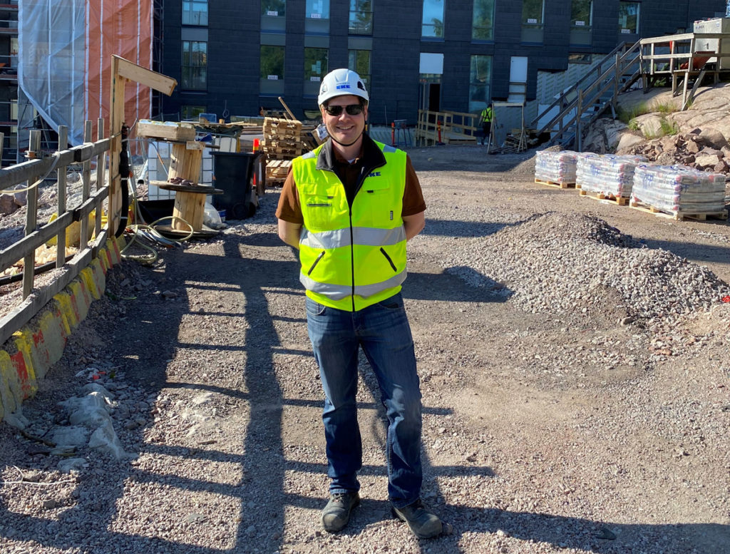 Aurinko paistaa kesäkuisena aamuna täydeltä terältä, kun saavun työmaa-alueelle Espoon Piispanporttiin tapaamaan työpäällikkö Miikka Huhtamäkeä. Miikka kävelee vastaan iloisesti tervehtien ja kertoo rakenteilla olevasta korttelista.