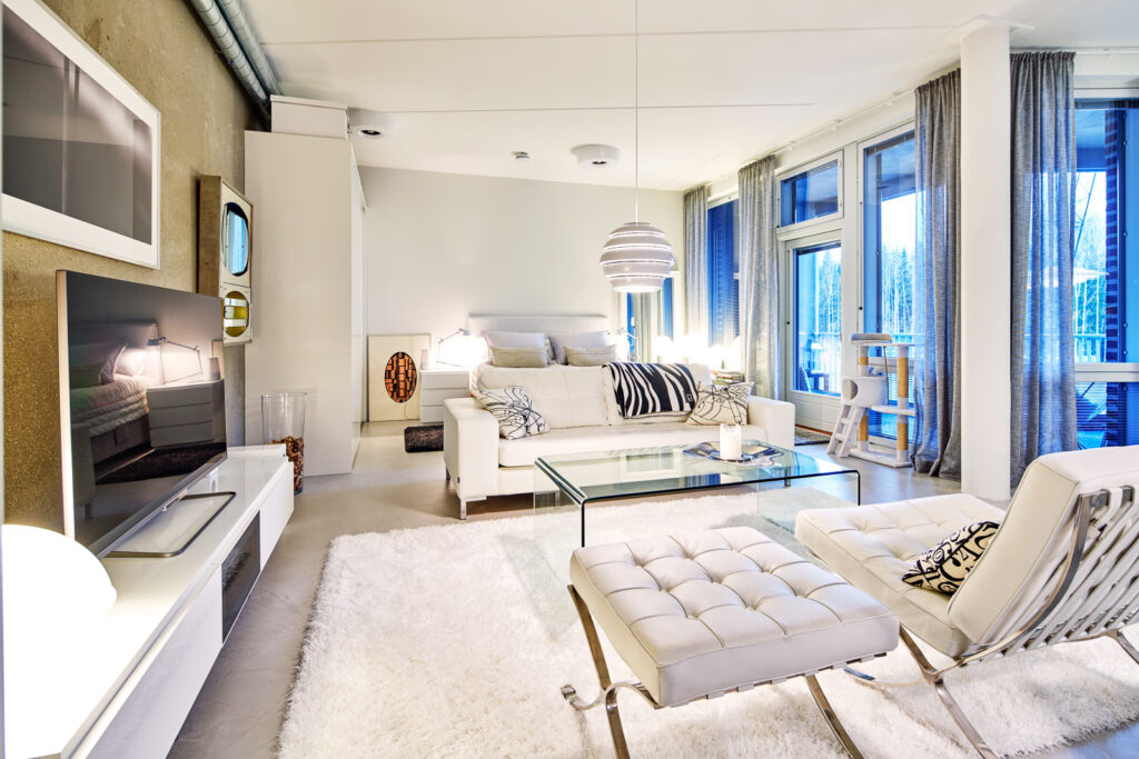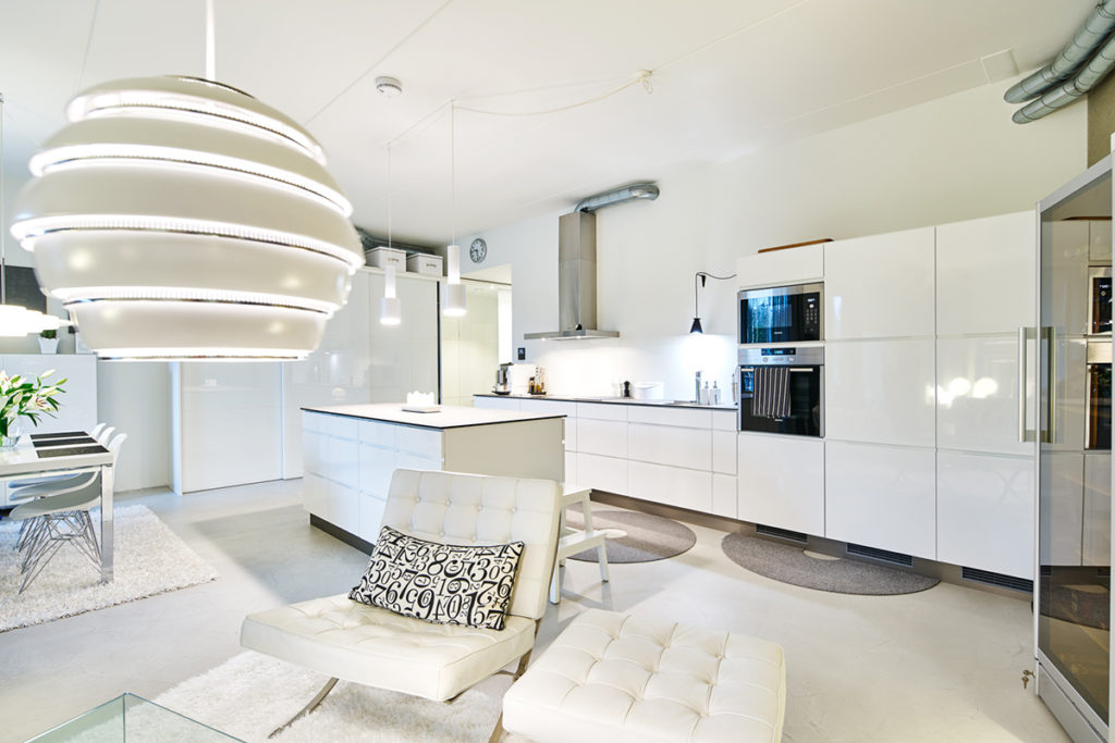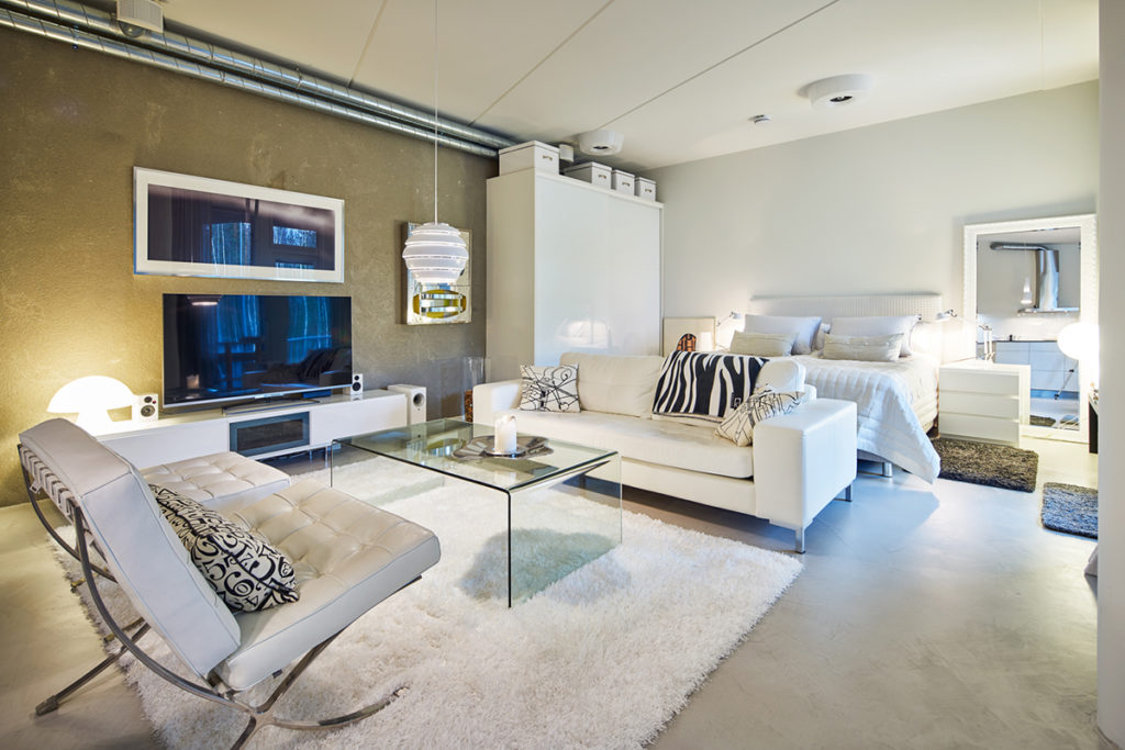 Asunnon sisustuksessa on käytetty paljon valkoista. Selkeät linjat, huolella valitut kalusteet sekä kolmen metrin huonekorkeus saavat asunnon näyttämään isommalta kuin onkaan.